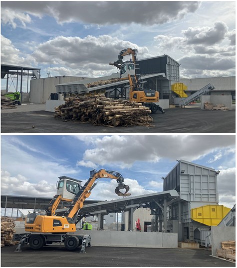 機械にぶつけないよう重機で原木丸太をチェーンデッキの上へ乗せています。