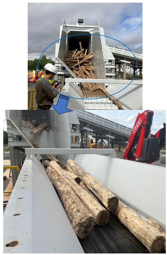 ディバーカからの排出側の様子です。うまく樹皮がむけています!出口で丸太が引っ掛かり詰まってしまわないようになっています。